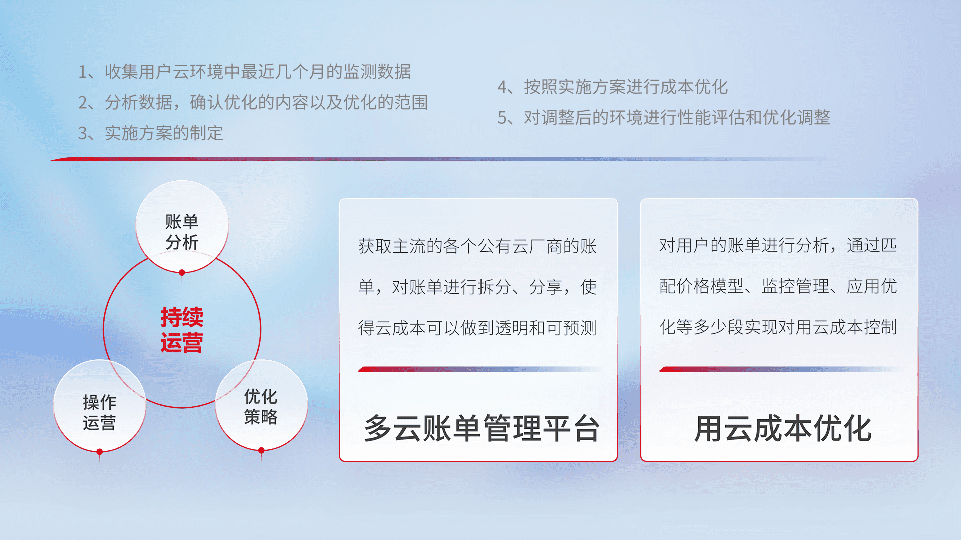 通过多云纳管,,,以统一的资源数据模型把客户的云资源进行抽象和封装,,,进而实现对多云资源的统一操作,,,保障云资源管理的可靠性、、、、稳定性与可用性。。量身定制化运维内容,,,配置、、、开发运维、、补丁管理、、、备份、、监控、、、、认证和访问管理、、、、审计和日常巡检等,,,保障在用云过程中的可靠度,,,,稳定度以及高可用率。。。。