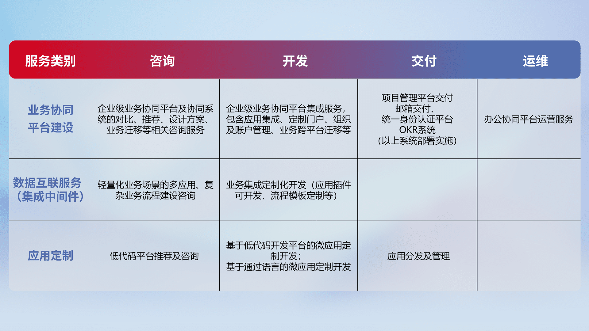 针对钉钉、、、企微、、、IDaas等平台级产品提供产品的规划、、、方案、、、、交付、、定制化开发等服务,,,,实现如统一协同办公、、智能客户服务、、、混合会议管理、、智能数据查询、、、、等业务场景,,,实现数字化转型。。
